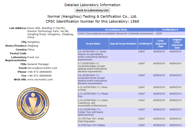 NormalTCI諾莫檢(jian)測實驗(yan)室已獲得CPSC認可資(zi)質