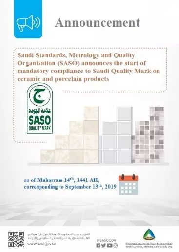 近日,沙特阿拉伯標準組織 SASO(Saudi Standards, Metrology and Quality Organization)發出公告,通知將開始對陶瓷產品(ceramic and porcelain products)強制執行沙特質量標志SQM (Saudi Quality Mark)要求。