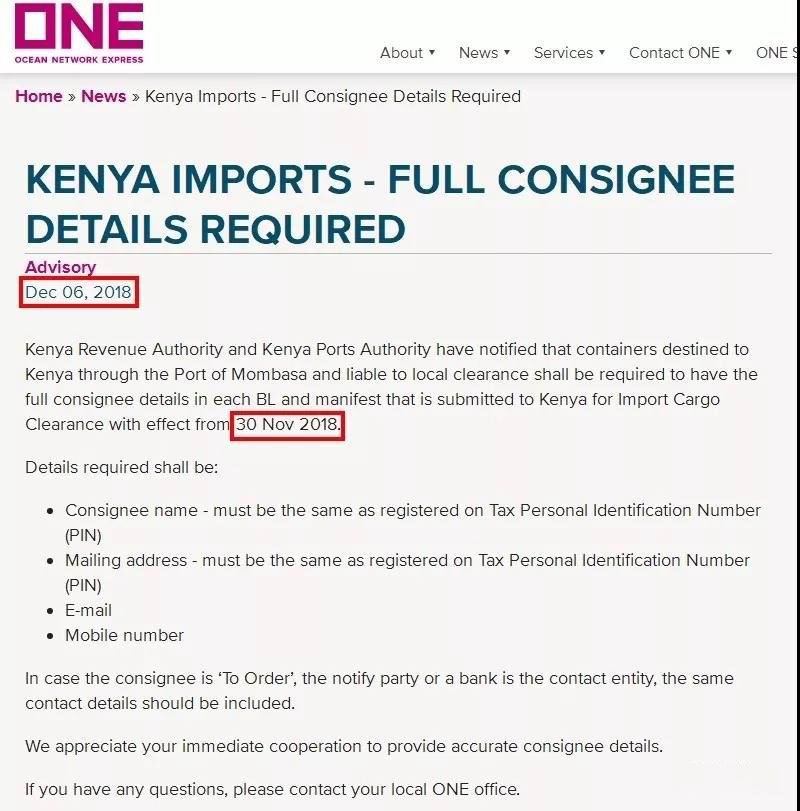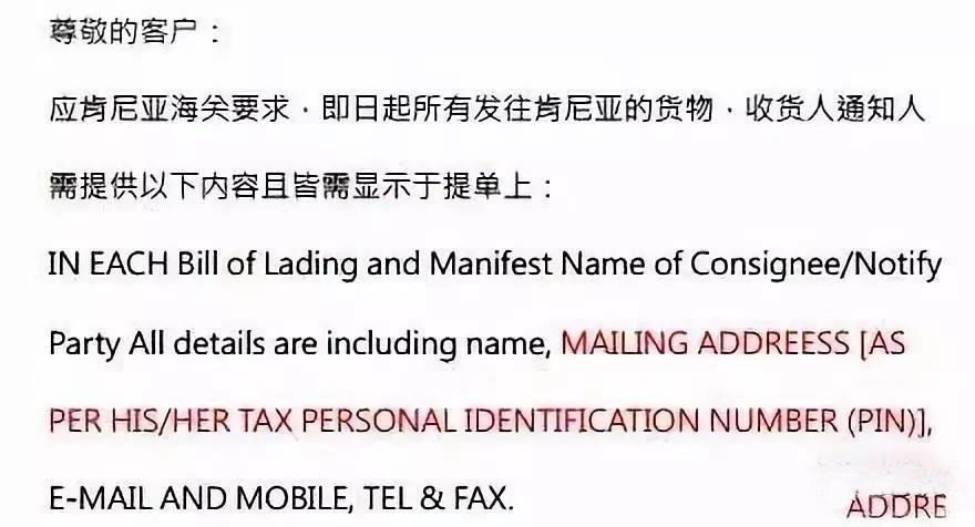 從2018年11月30日起(qi),所有運往(wang)肯尼亞港口的貨物,在(zai)提單收(shou)貨人、通知人一欄,必須完(wan)整填寫以下信息: