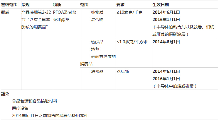 挪威近日(ri)宣布(bu)將限制(zhi)消費品中的全(quan)氟辛酸化(hua)合物(perfluorinated compound ,PFOA)。生效日(ri)期將根據產品屬性從2014年6月開始生效。