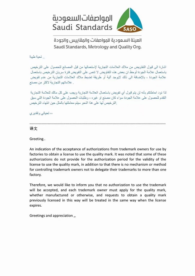 沙特標準局SASO關于QM的通知