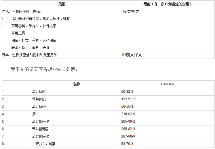 REACH法規(gui)附錄17第50條主要(yao)是限(xian)制輪(lun)胎的填充油中的多(duo)(duo)環(huan)芳香烴(PAHs),此次提案(an)將多(duo)(duo)環(huan)芳香烴(PAHs)的限(xian)制擴展到了能(neng)長期(qi)或短期(qi)重復接觸皮膚或口腔的產品。具體信息(xi)如下: