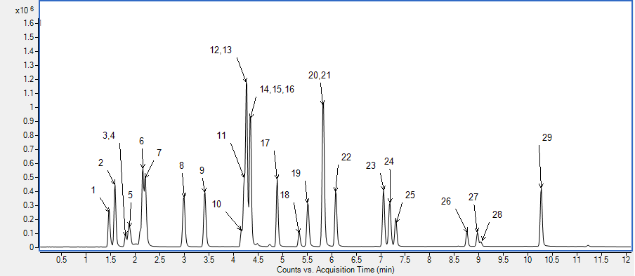 29種芳香族伯胺(an)在液相色譜(pu)-串聯質譜(pu)中的總(zong)離子(zi)流(liu)色譜(pu)圖(tu)