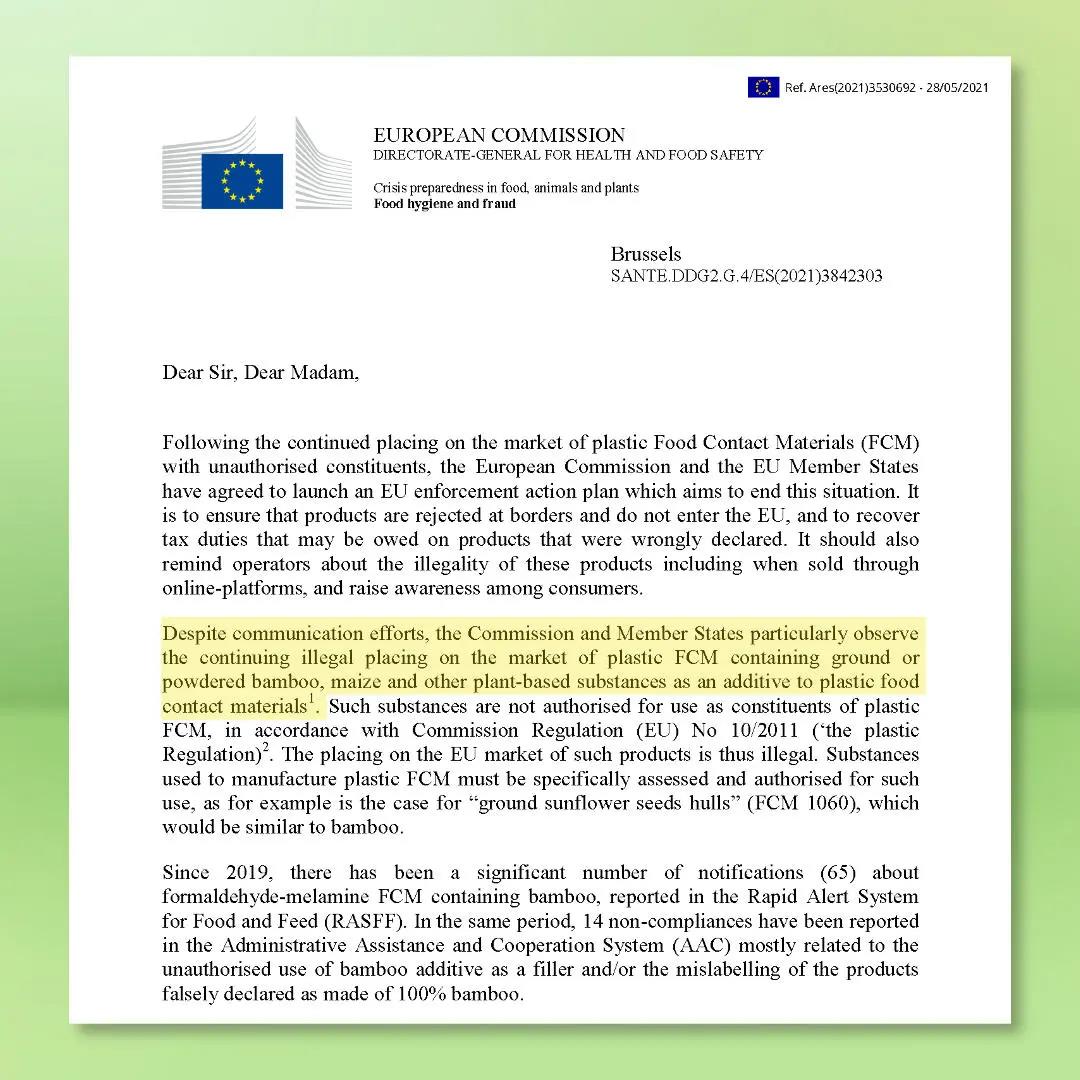 然而(er)2021年(nian)5月28日(ri),歐(ou)(ou)盟委員(yuan)會通過郵件通知(zhi)利益相(xiang)關者,表示會協助(zhu)歐(ou)(ou)盟成(cheng)員(yuan)國啟動“停止含有未經授(shou)權的(de)含竹纖維類塑料材料及制(zhi)品在市場上銷售”的(de)強制(zhi)計劃。一紙禁令(ling)導致相(xiang)關產業急剎車。