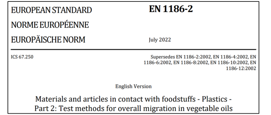新版(ban)EN 1186-2:2022:將測試“橄欖油中總遷移量”的原六項2002版(ban)標準EN 1186-2、1186-4、1186-6、1186-8、1186-10和1186-12整合為(wei)一個標準。