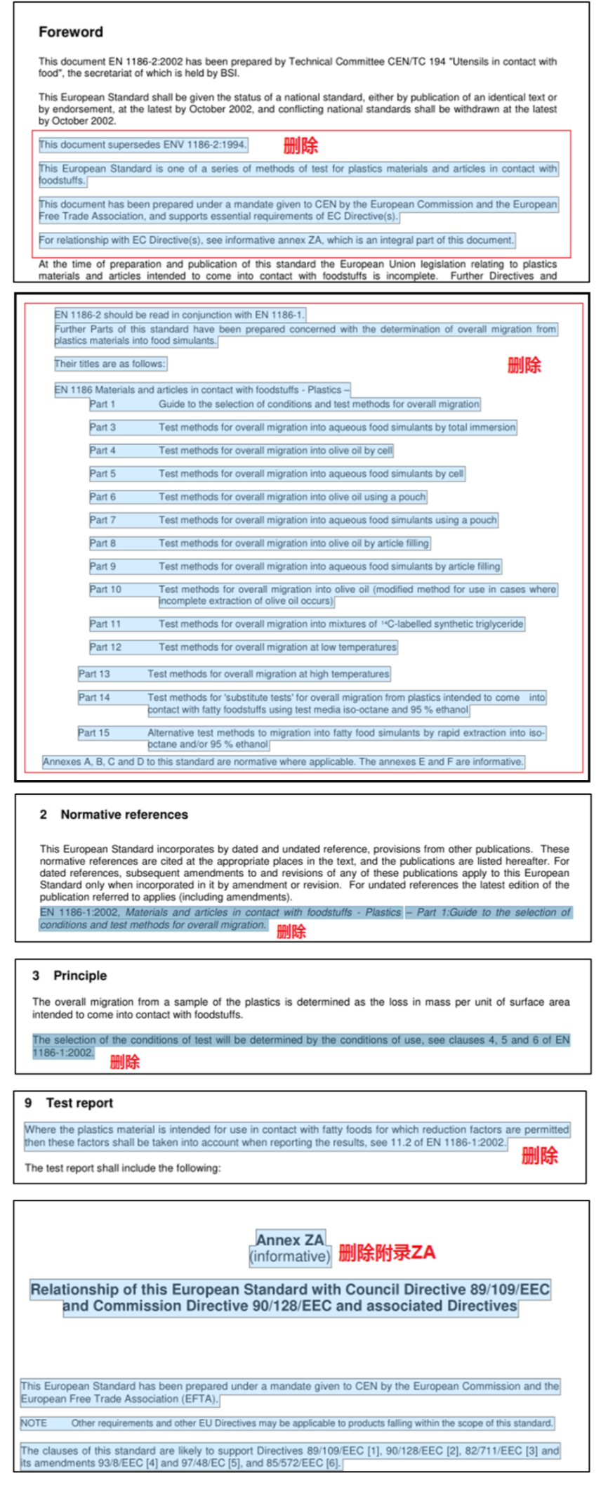 刪除(chu)了2002版標準中前言、第(di)二章、第(di)三章及(ji)文中測試步驟(zou)、測試報告中對(dui)EN 1186-1:2002的(de)引用(yong),同時也刪除(chu)了原標準附錄ZA及(ji)相(xiang)關引用(yong),以避免相(xiang)關法規更新后導(dao)致標準的(de)失效(xiao)。