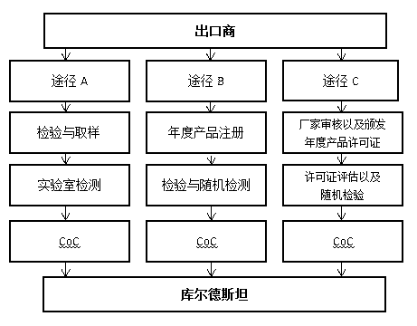 根據途徑 A,即將裝運的管制產品必須經過合規驗證及物理檢驗,以證明符合庫爾德斯坦相關標準及必需的要求。 認證流程如下: