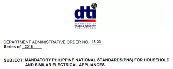 2018年1月29號,在馬尼拉市馬卡迪區,菲律賓政府簽署了第18-03號行政法令。該法令的名稱是“家用和類似用途電器的強制性菲律賓標準”。