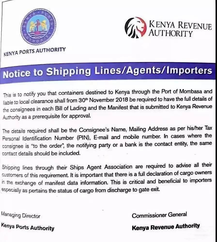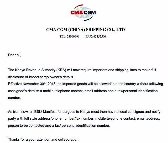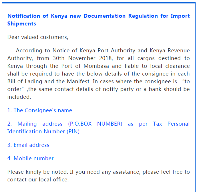 從2018年11月30日起(qi),所有運往(wang)肯尼亞港口的貨物,在(zai)提單收(shou)貨人、通知人一欄,必須完(wan)整填寫以下信息: