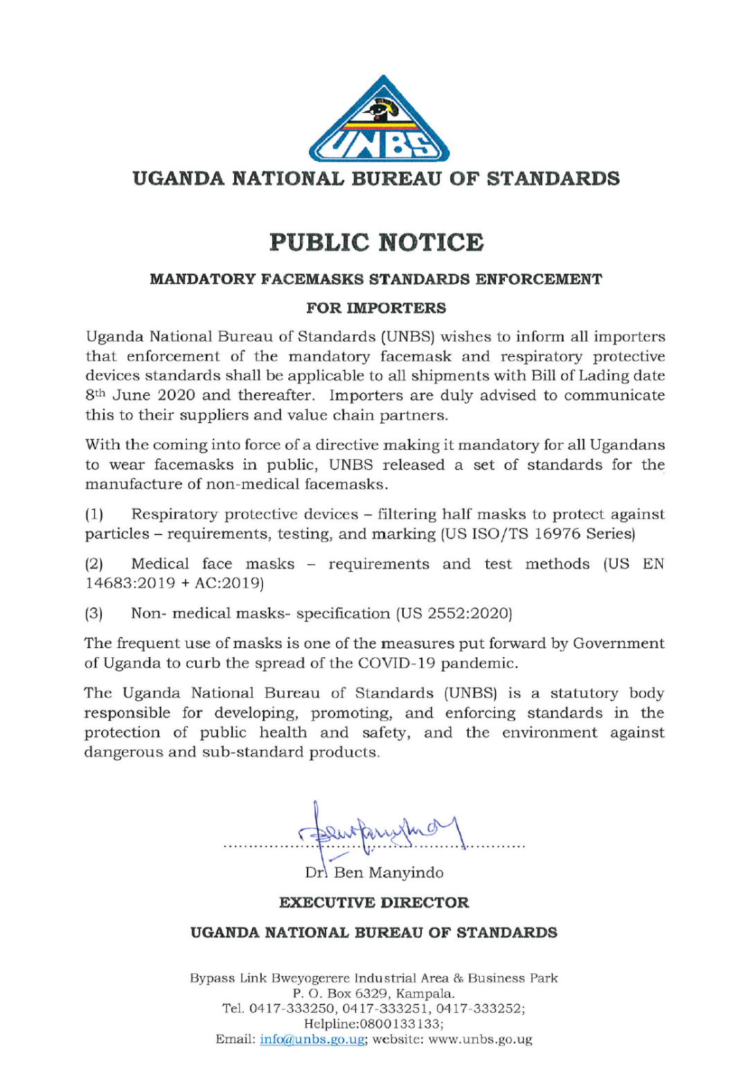 烏(wu)干達國家標(biao)(biao)準局 UNBS(Uganda National Bureau of Standards)最新公告, 為(wei)了保護公眾健康(kang)和安全(quan),從(cong)2020年6月8日(提單日期(qi))起(qi),口(kou)罩和呼吸防護設備出口(kou)至烏(wu)干達需要強制執行如下標(biao)(biao)準: