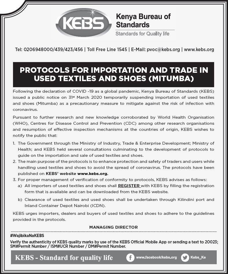 近(jin)日(ri),肯(ken)(ken)尼亞標準局Kenya Bureau Of Standards (KEBS) 頒(ban)布,肯(ken)(ken)尼亞將(jiang)恢復二手服裝與(yu)(yu)二手鞋類產品的(de)進(jin)口與(yu)(yu)銷售,同(tong)時KEBS已制定新協議(yi)(yi)進(jin)行(xing)規(gui)范與(yu)(yu)指(zhi)導。該協議(yi)(yi)的(de)主要目的(de)為加強(qiang)對(dui)貿易商(shang)與(yu)(yu)消費者(zhe)/ 使用者(zhe)的(de)保護與(yu)(yu)安全,避免疫情的(de)傳播。該協議(yi)(yi)已發布在KEBS官方(fang)網站(zhan)。