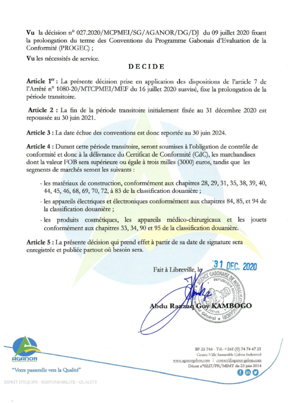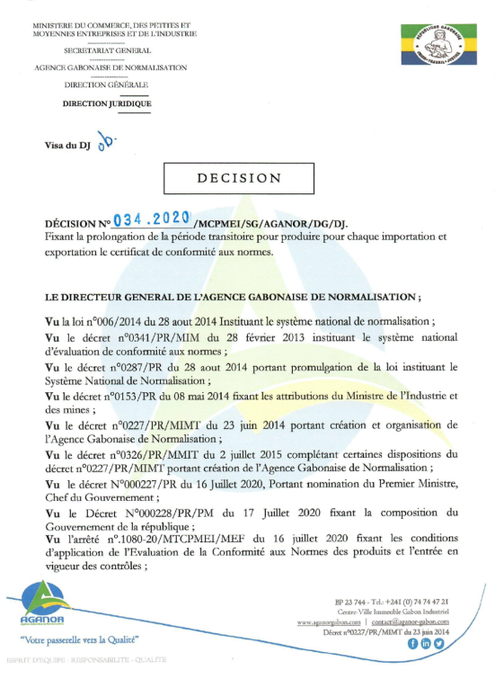 近日,加蓬標準(zhun)化機構 AGANOR (Agence Gabonaise de Normalisation) 再次發布了最新(xin)公告,為(wei)了能促進(jin)更多人理解(jie)并更好地執行(xing)該方案(an),決(jue)定將新(xin)法令執行(xing)過渡期再推(tui)遲至(zhi)2021年6月30日。