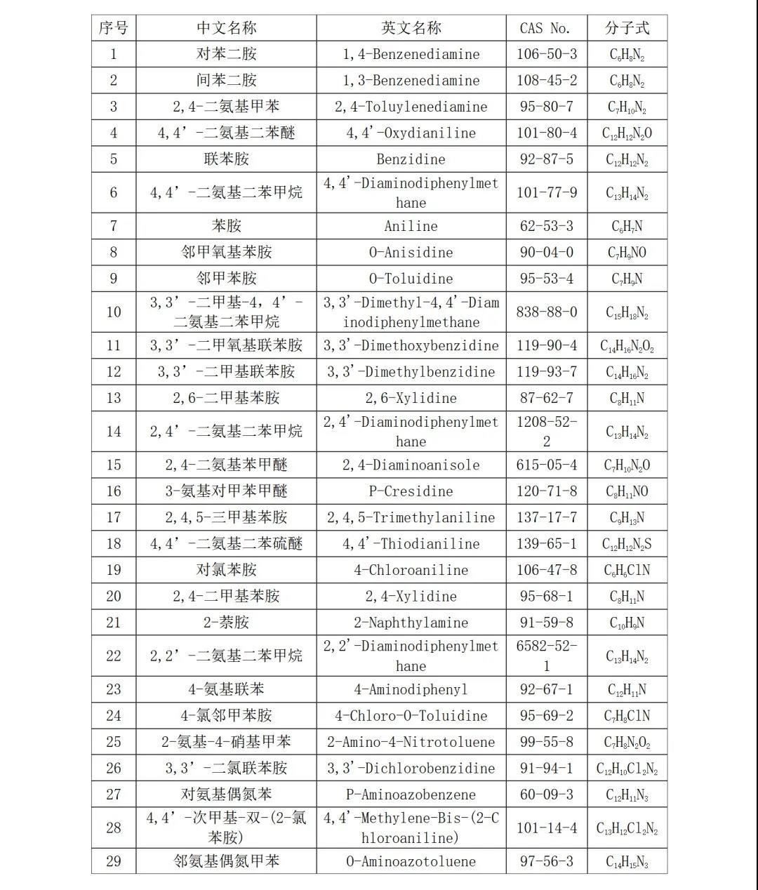 標準規定了食品接觸材(cai)料(liao)及制(zhi)品中29種芳(fang)香族伯(bo)胺遷移量的(de)測定方法(fa)。下圖為29種芳(fang)香族伯(bo)胺的(de)名(ming)稱、CAS號以及分子式。
