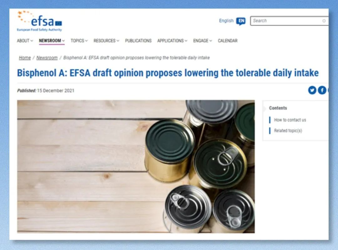 2021年12月15日,歐洲(zhou)食品(pin)安全(quan)局(EFSA)發布了(le)進一步降低(di)BPA每日可耐受(shou)攝入量(TDI)的(de)(de)草案(an),將BPA的(de)(de)TDI從2015年EFSA設(she)置(zhi)的(de)(de)臨時TDI(t-TDI) 4μg/kg·bw/d降至(zhi)0.04ng/kg·bw/d。