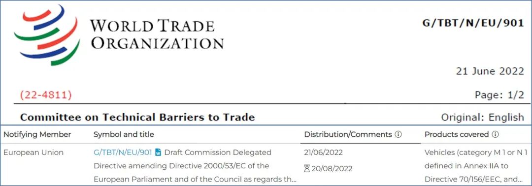 2022年6月21日(ri),歐盟委員會向WTO的(de)(de)TBT委員會提(ti)交G/TBT/N/EU/901通知,擬對歐盟ELV指令(End-of Life Vehicles, Directive 2000/53/EC)的(de)(de)附(fu)件(jian)II(豁免清(qing)單)中用(yong)于加工用(yong)途(tu)的(de)(de)鋁(lv)合金,銅合金和某些電池中的(de)(de)鉛的(de)(de)豁免條款進(jin)行更新(xin)。