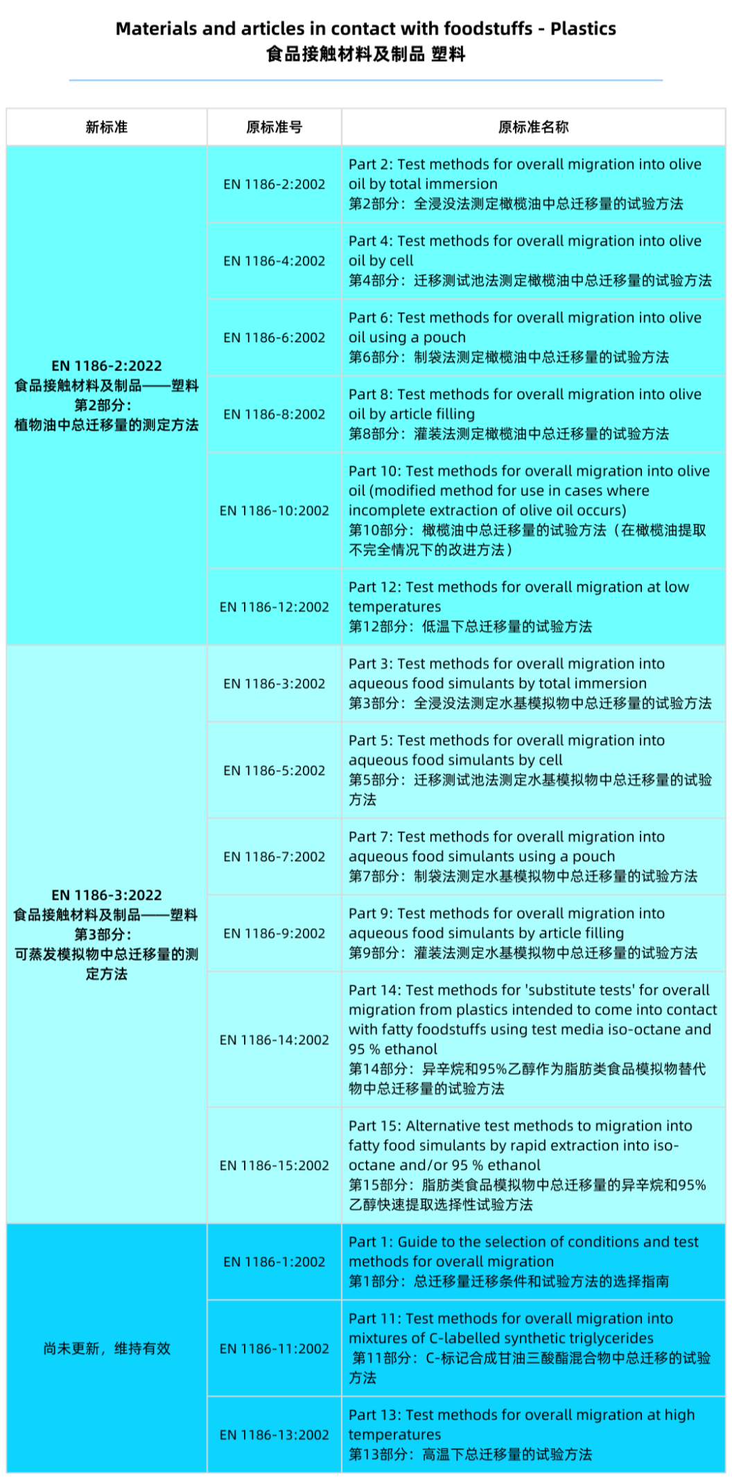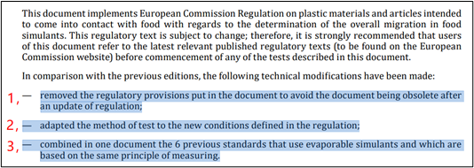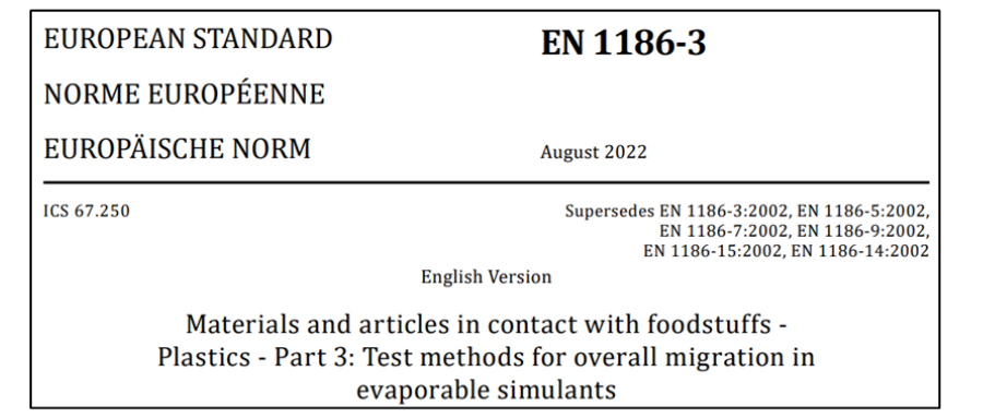 新版EN 1186-3:2022:將(jiang)測試“水基模擬物及(ji)替(ti)代溶劑中總遷(qian)移量”的(de)原六項2002版標(biao)準EN 1186-3、1186-5、1186-7、1186-9、1186-14和1186-15整合為一個標(biao)準。
