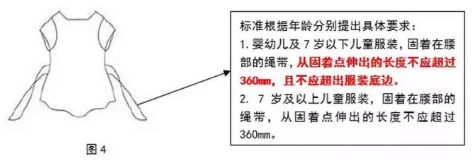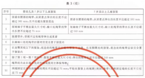 3 | 機(ji)械(xie)安全 | 標準對兒童服裝(zhuang)頭頸(jing)、肩部(bu)、腰部(bu)等不同部(bu)位繩帶作出(chu)詳細規定,要求(qiu)嬰幼兒及7 歲以(yi)下兒(er)童(tong)服裝頭頸部不允許存在任何繩帶; 標準對紡織附(fu)件(jian)(jian)也做出了規定,要求附(fu)件(jian)(jian)應具有一(yi)定的抗(kang)拉強力,且不(bu)應存在(zai)銳(rui)利尖端和(he)邊緣。 |