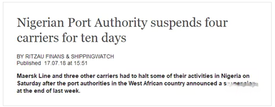 尼(ni)日利亞港務局(NPA)在一份新聞(wen)稿中表示,從(cong)當地時(shi)間7月14日(ri)開始,尼(ni)日(ri)利亞所有港(gang)口將暫停對馬士基,中遠海(hai)運,APS和Lansal四家(jia)航(hang)運公司提供港口服務,為(wei)期(qi)10天!