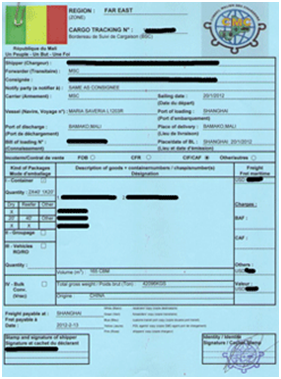 根據馬里(MALI)港務局要求:針對發往馬里的貨物,必須辦理馬里CTN NO.(貨物跟蹤號碼),否則在起運港船公司無法正常出具海運提單,目的港將無法清關和提貨。馬里CTN NO.和尼日利亞CTN NO.類似,CTN NO.是英文Cargo Tracking Note Number的首字母縮寫,意思是貨物跟蹤號碼,又稱為貨物進口清單。